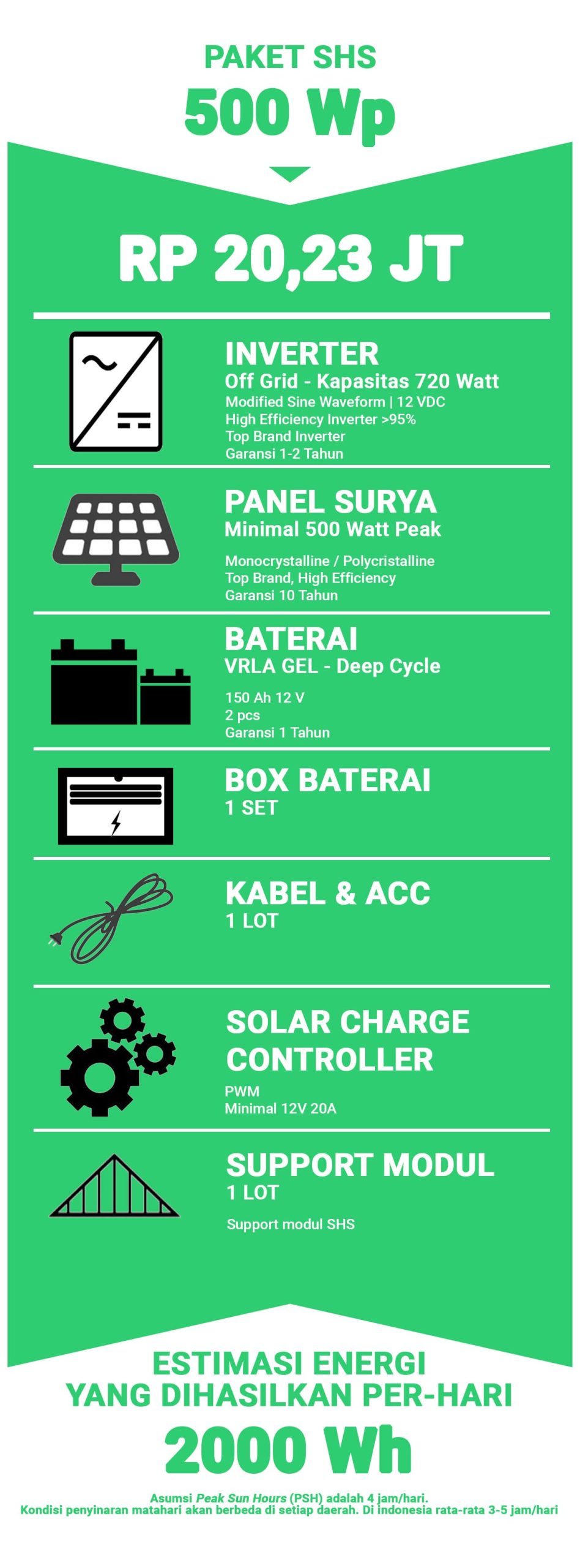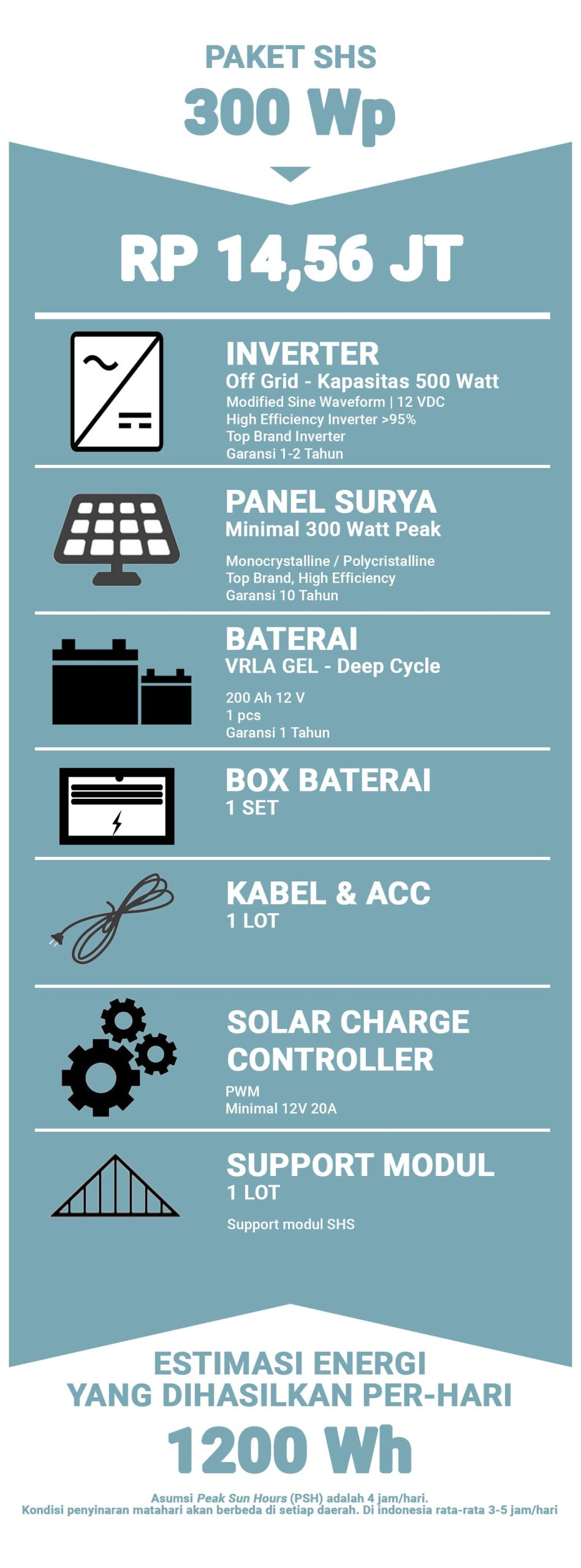 Solar Home System atau biasanya kita sebut SHS adalah sistem PLTS Off Grid dengan skala yang kecil. Biasanya hanya untuk kapasitas di bawah 1000. SHS ini sangat cocok untuk Rumah-rumah warga di daerah yang belum teraliri listrik PLN. Lalu apakah bisa SHS ini dipakai di perkotaan? Jawabannya Tentu Bisa! SHS ini sangat cocok untuk penggunaan di Pos Satpam/Security atau bangunan yang kebutuhan listriknya skala kecil.